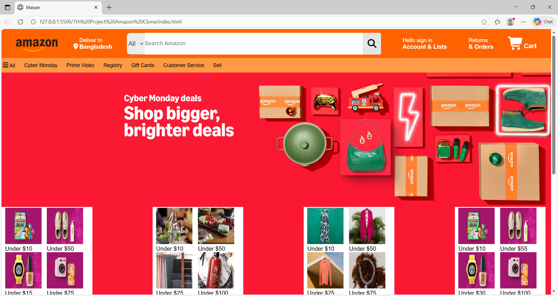 This project is a Amazon homepage clone built with HTML and CSS, focusing on layout, typography, and visual hierarchy. It recreates the hero section, branding, and call-to-action elements, demonstrating responsive design principles and clean, well-structured front-end code.