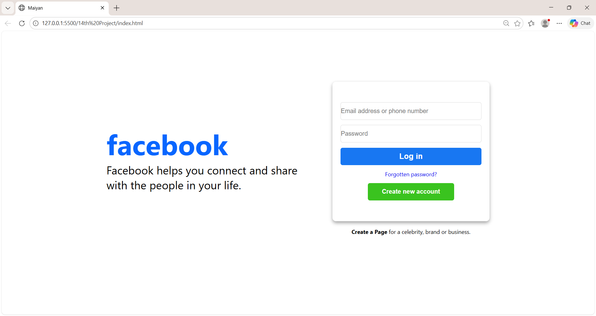 This HTML code recreates a Facebook-style login page using semantic structure and clean layout. It includes a branding section, login form with email and password inputs, action buttons, and helper links. The design is responsive-ready and styled externally through a linked CSS file for modern web practice and visual clarity.